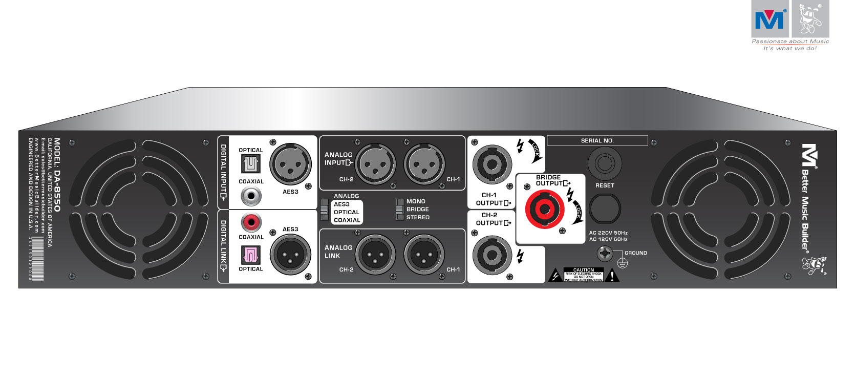 Better Music Builder is adding three new professional grade amplifiers to our DA Series products, the DA-8350, DA-8550, and DA-8750. These digital amplifiers provide only the best in audio quality and ease of use for the professional.