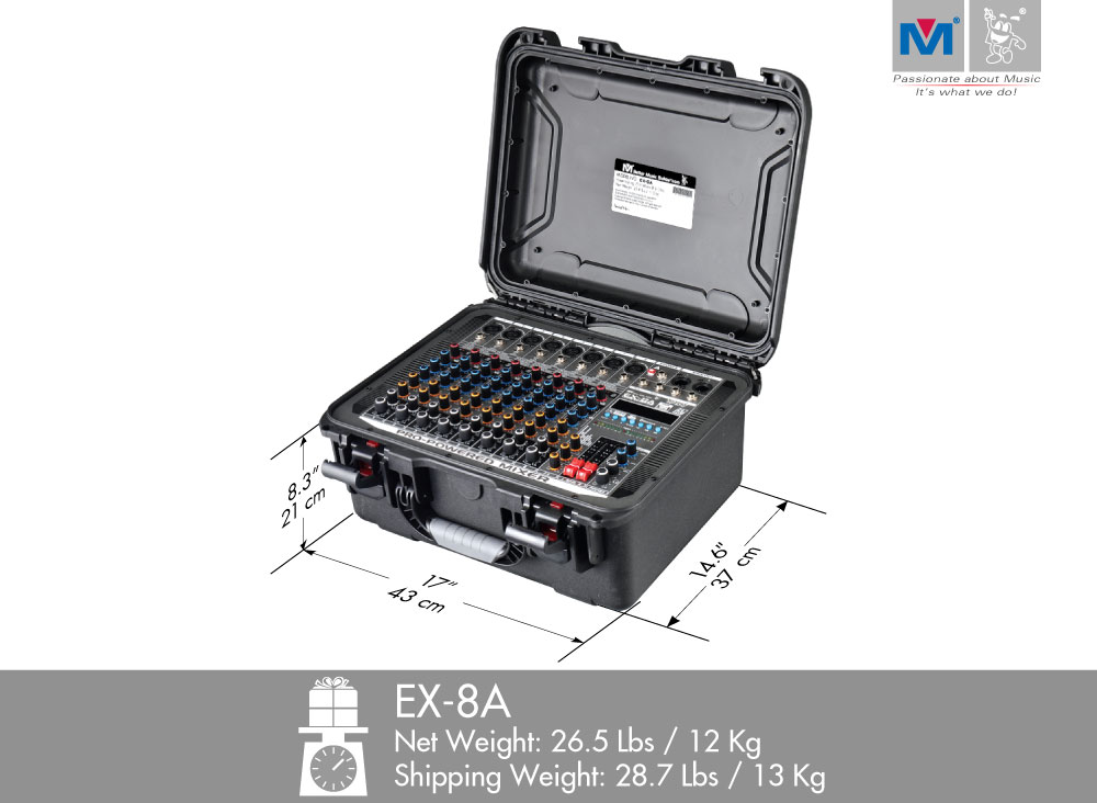While keeping the integrity and quality of the original EX-8, the improved connectivity drives the new Better Music Builder 8-Channel Pro-Powered Mixer EX-8A into the digital age. It is an upgrade Mixer that follows Better Music Builder’s long tradition of utilizing the most advanced technologies to bring you the best products. New to Better Music Builder the EX-8A Professional Powered Mixer has a built-in power amplifier module and is perfect for the audio enthusiast and home entertainment experts.